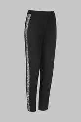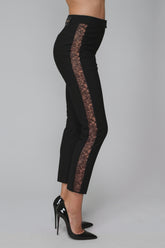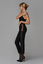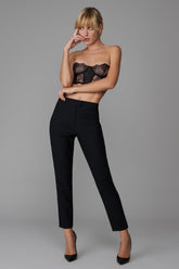 Die Hose mit dem eng anliegenden Zigarettenschnitt ist aus ungefüttertem Wolltuch gefertigt. Sie zeichnet sich durch Streifen aus französischer Leavers-Spitze aus, die mit einer Satinpaspel verziert sind und die Beine von den Knöcheln bis zur Hüfte betonen.