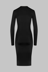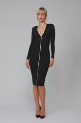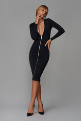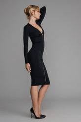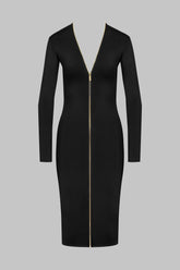 Das Midikleid zeichnet sich durch einen sehr eng anliegenden Schnitt aus und sorgt für eine schlichte, selbstbewusste Silhouette. Es ist aus blickdichtem Stretch-Jersey gefertigt und ist mit langen Ärmeln und einem tiefen V-Ausschnitt versehen, der mithilfe des goldfarbenen Metallreißverschlusses angepasst werden kann, sodass Sie je nach Anlass zwischen einem gewagten oder eher zurückhaltenden Look wählen können. Der von Maison Close entwickelte Zwei-Wege-Reißverschluss erstreckt sich über die gesamte Länge des Kleides hinweg und verläuft wie ein Schmuckstück über den Nacken.