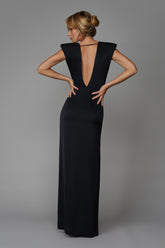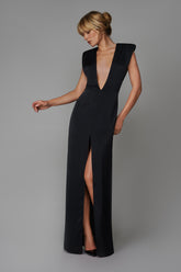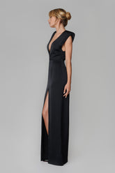 Das lange Kleid zeichnet sich durch einen geraden, an der Taille eng anliegenden Schnitt aus. Die schwindelerregenden, mit Satin gefütterten Schulterpolster sorgen für eine selbstbewusste und strukturierte Silhouette. Es ist aus doppelseitigem, blickdichtem Satin gefertigt, weich fließend und hebt sich durch eine unvergleichliche Qualität hervor. Dieses Modell besticht durch seinen tiefen V-Ausschnitt vorne und im Rücken. In der Mitte sublimiert ein gewagter Schlitz die Vorderseite der Beine. Ein unsichtbarer Reißverschluss an der Seite hebt die tadellose Passform der Taille hervor.