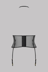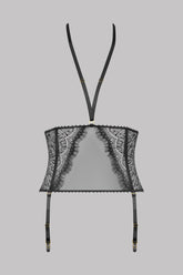 Taillencorsage mit Strumpfhaltern aus recycelter Spitze. Die Form vereint eine Spitze und transparentem Tüll, eingefasst mit einer elastischen Picotkante. Der grafische Schnitt unterstreicht die Taille. Strumpfhalter und abnehmbarer Harnisch, mit goldenen Accessoires verstellbar Senkreichte weiche Streben für mehr Struktur und Halt. Verstellbarer Hakenverschluss am Rücken. Als Strumpfhalter oder als Taillencorsage zu tragen.