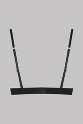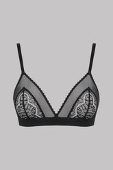 Bügelloser Triangel-BH aus recycelter Spitze. Die Form vereint eine Spitze und transparentem Tüll, eingefasst mit einer elastischen Picotkante. Ein breites, elastisches Band unterhalb der Brust sorgt für einen guten Halt. Verstellbare, elastische Träger und verstellbarer Hakenverschluss am Rücken.