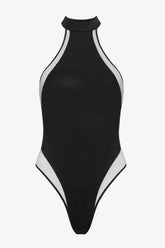 Der Badeanzug mit amerikanischem Ausschnitt Minuit setzt auf ein ausdrucksstarkes Design, in dem blickdichte Mikrofaser und transparenter Tüll verschmelzen – veredelt durch einen schwarz-silbernen Metallic-Film, der das Licht subtil einfängt. Sein körpernaher, hoch ausgeschnittener Schnitt in String-Form, kombiniert mit dem amerikanischen Halsausschnitt, streckt optisch die Silhouette und enthüllt den Rücken auf raffinierte Weise. Der Tüll an Armausschnitten, Rücken und entlang der Oberschenkel, eingefasst mit glänzender Mikrofaser, verleiht der Silhouette eine elegante Struktur. Gefertigt aus formender, angenehmer Mikrofaser und im Schritt gefüttert, bietet dieser Badeanzug optimalen Tragekomfort. Verschluss im Nacken durch einen silberfarbenen Haken.
