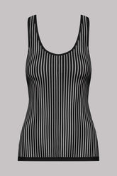 Tanktop aus Mikrofaser mit transparenten, grafischen Streifen im Ajour-Stil. Der klassische Schnitt ist dem minimalistischen Stil eines Herrenhemds nachempfunden, erhält jedoch mit dem abgerundeten Halsausschnitt und dem betonten Racerback eine raffiniert feminine Ausstrahlung. Der Halsausschnitt und die Armausschnitte sind mit unifarbenen Paspelierungen aus Mikrofaserstoff versehen.