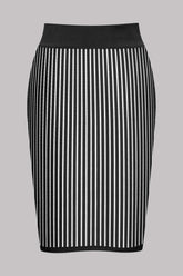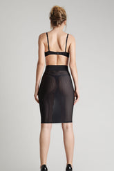 Halblanger Rock aus Mikrofaser, für eine Akzentuierung der Silhouette mit transparenten, grafischen Streifen im Ajour-Stil ausgeführt. Ein breiter, elastischer Gürtel mit einem unifarbenen Bezug aus schwarzer Mikrofaser strukturiert die Taille.