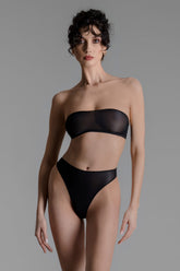 Bandeau-BH ohne Bügel, gefertigt aus einem feinen Jersey mit glänzenden und dezent transparenten Reflexen. Eingefasst mit einem ultraflachen Gummiband, das unter der Kleidung unsichtbar ist. Ein breites elastisches Band sorgt für sicheren Halt rund um die Brust. Das goldene Maison Close Logo ist auf dem Rücken angebracht. Zum An- und Ausziehen einfach über den Kopf ziehen.