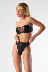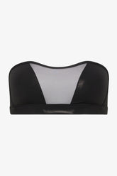 Das Bandeau-Bikini-Oberteil Minuit spielt mit Kontrasten und Transparenz – eine raffinierte Komposition aus blickdichter schwarzer Mikrofaser und transparentem Tüll, dezent schimmernd durch einen schwarz-silbernen Metallic-Film. Ohne Polsterung und Bügel bietet dieses Oberteil leichten Halt dank weicher Stäbchen an den Seiten und einem unter der Brust verdeckten Gummiband. Der tief ausgeschnittene Tüll, eingefasst mit glänzender Mikrofaser, lässt die Brust auf elegante Weise durchscheinen. Trägerlos und ohne Silikonband für maximalen Komfort und ein natürliches Tragegefühl.