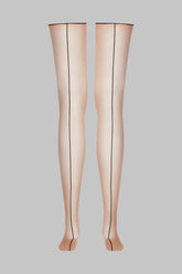 Als ein wahres Schmuckstück für Ihre Beine umspielen diese nudefarbenen Strapsstrümpfe aus Voile 20 den raffiniert die Beinkonturen und lassen ihre Gegenwart nur durch die absolut angesagte schwarze Naht erkennen.