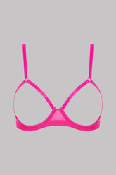 Offener BH und Bügeln aus Tüll in Neonfarbe ist ein extravagantes Modell der Kollektion.