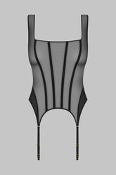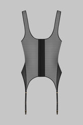 Der L’AMOUREUSE-Body mit V-Ausschnitt aus absolut transparentem Tüll besticht durch ein tiefes Dekolleté vorne und hinten. Der Ausschnitt ist mit drei Schlaufen verstellbar und der Schritt mit einem Hakenverschluss zu öffnen. Ein hoch ausgeschnittener String vollendet diese grafische Silhouette.