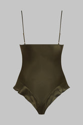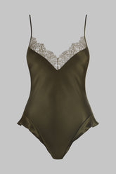 String-Body aus Seide und Wimpernspitze. Unser berühmter, extrem femininer „französischer Schnitt“ mit einem Hauch von Retro, der die Hüften und den Po wirkungsvoll in Szene setzt. Der V-Ausschnitt, der mit fester Spitze verziert ist, schmiegt sich sanft an die Brust. Zarte verstellbare Träger aus Seide mit goldenen Details. Lässt sich im Schritt nicht öffnen, um den Tragekomfort zu erhöhen.
