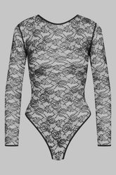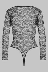 Der tief ausgeschnittene Stringbody mit langen Ärmeln ist mit durchbrochener Spitze aus überwiegend recyceltem Material verziert. Das Modell ist mit einem flachen Gummiband eingefasst und hat eine sehr tief ausgeschnittene Form, die Ihre Hüften im 80er Jahre Stil betont. Verstellbarer Häkchenverschluss im Schritt.