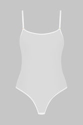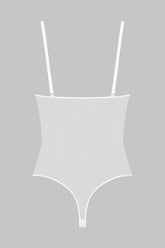Der String-Body in der Farbe Weiß besteht aus einem weichen Tüll mit schillernder Transparenz.