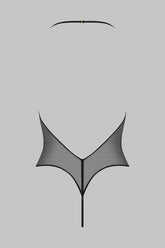 Der String-Body L’AMOUREUSE aus einem Tüll von absoluter Transparenz besticht durch einen tiefen Ausschnitt vorn und am Rücken. Im Nacken ist er durch drei Schlaufen verstellbar und zu öffnen, im Schritt durch einen Hakenverschluss. Der tief ausgeschnittene String im Schnur-Stil rundet diese grafische Silhouette ab.