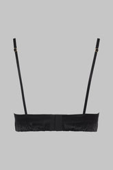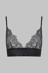 Bustier-Triangel-BH aus Seide und Wimpernspitze. Bügelfreie Triangel-Cups aus transparenter fester Spitze, die sich perfekt an die Brust anschmiegen. Ein breites, mit geraffter Seide bedecktes Gummiband am Rücken sorgt für perfekten Halt. Verstellbarer Hakenverschluss am Rücken. Zarte verstellbare Träger mit goldenen Details.