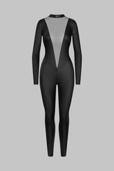 Catsuit in doppelter Optik: mattes Leder und transparenter Tüll. Grafische tiefe V-Ausschnitte aus Tüll, die das Dekolleté betonen und den Rücken freilassen. Von vorne nach hinten mit einem Ton in Ton verlaufenden Zweiwegereißverschluss zu schließen. Als Kennzeichen der Kollektion ziert ein vergoldeter Ring im "Feti-Chic" den Kragen und regt zum Festbinden an.