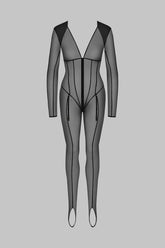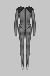 Der L’AMOUREUSE-Catsuit aus absolut transparentem Tüll ist vollständig durch Nähte strukturiert, die die Silhouette formen. Doppelter Couture-Strumpf-Effekt mit Stegabschluss. Abnehmbare äußere Strapse ermöglichen das Tragen von Strümpfen über dem Catsuit – für ein Spiel mit Transparenz. Durchgehender Zwei-Wege-Reißverschluss, mit doppellagigem Tüll an den Schultern.