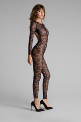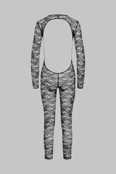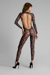 Der Catsuit mit offener Rückseite und langen Ärmeln ist mit Lochspitze verziert, die größtenteils aus recyceltem Material gefertigt wird. Eng anliegender Schnitt und flaches Gummiband. Der schwindelerregende Rückenausschnitt versetzt uns zurück in die 80er Jahre.