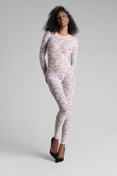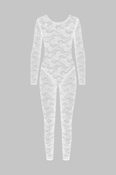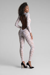 Der Catsuit mit offener Rückseite und langen Ärmeln ist mit Lochspitze verziert, die größtenteils aus recyceltem Material gefertigt wird. Eng anliegender Schnitt und flaches Gummiband. Der schwindelerregende Rückenausschnitt versetzt uns zurück in die 80er Jahre.