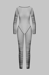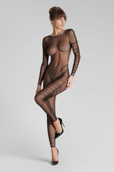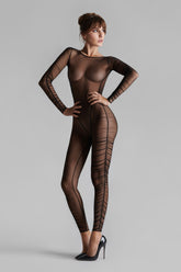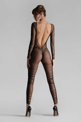 Catsuit aus gänzlich transparentem Tüll, dem durchgehend applizierte Faltennähte eine raffinierte Struktur verleihen. Der tiefe V-förmige Rückenausschnitt enthüllt, was entdeckt werden will und wird durch die Geschmeidigkeit eines sinnlichen Tiger-Designs ergänzt. Der Hals- und Rückenausschnitt sind mit blickdichtem Stoff eingefasst.
