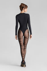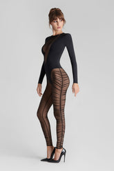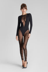 Langärmeliger Catsuit aus zwei Materialien. Vom Rundhalskragen aus zeichnet sich ein blickdichter, tief ausgeschnittener Body ab, ergänzt durch einen tiefen V-Ausschnitt mit plissiertem Tüll, der ihn mit einem aparten Tiger-Design ergänzt, das auch die subtil transparente Beinpartie prägt. Ein Catsuit, dem die kontrastierenden Materialien einen verspielt eleganten Akzent verleihen. Der rückseitige Reißverschluss ist mit goldfarbenem Zierschmuck besetzt.