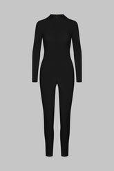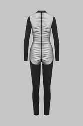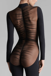 Ein langärmeliger Catsuit aus zwei Materialien, dessen transparenter, durch Faltennähte strukturierter Tüll bis unter das Gesäß reicht und für eine elegante, sinnliche Akzentuierung der Rückenpartie sorgt. Der blickdichte Stoff auf der Vorderseite setzt auf ein raffiniertes Spiel mit Hell-Dunkel-Kontrasten. Die ab dem Stehkragen ausgeführte Reißverschlussöffnung ist mit goldfarbenem Zierschmuck besetzt.