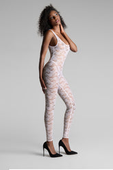 Der Catsuit mit offener Rückseite ist mit Lochspitze verziert, die größtenteils aus recyceltem Material gefertigt wird. Eng anliegender Schnitt und flaches Gummiband. Das Dekolleté, der tiefe Armausschnitt und der atemberaubende Neckholder erinnern an die 80er Jahre.