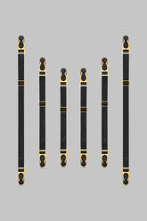 Sechs abnehmbare und verstellbare Doppel-Strumpfbänder mit goldfarbenen Applikationen. Dank der Zwei-Wege-Halter können Sie Ihre Strümpfe mit all Ihren Dessous und den Prêt-à-porter-Modellen von Maison Close kombinieren, ohne einen Strumpfhalter zu benötigen. Nach Lust und Laune spielen, eine Gelegenheit für jede Muse, ihren eigenen Mix and Match zu kreieren.