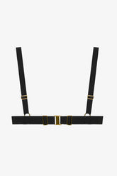 Das Balconette-Bikini-Oberteil Fatale vereint Komfort und Halt mit einem eleganten, strukturierten Schnitt. Die leicht gepolsterten Cups sind mit weicher Mikrofaser überzogen und werden durch ein breites, freiliegendes Gummiband entlang des Dekolletés akzentuiert. Ein „Mono“-Bügel sorgt für dezenten Halt, unterstützt durch Brustabnäher für eine natürliche Passform. Die breiten, stoffbezogenen Träger verlaufen direkt aus den Bügeln und lassen sich mithilfe goldfarbener Metallelemente individuell verstellen. Der Rücken ist verstellbar und wird durch ein breites, überzogenes Elastikband für zusätzlichen Komfort gestützt.