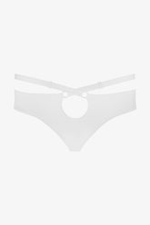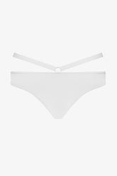 Das Tanga-Bikinihöschen – Fatale ist aus blickdichter, weicher und formender Mikrofaser gefertigt und bietet ein komfortables Second-Skin-Gefühl. Der leicht hoch geschnittene, ausgeschnittene Schnitt verlängert das Bein und betont gleichzeitig die Taille. Ein raffiniertes Spiel aus Bondage-inspirierten Elastikbändern, akzentuiert durch einen goldfarbenen Ring vorne und zwei am Rücken, die sich zu einem verstellbaren Tropfendetail öffnen. Das Taillenband ist über kleine, nicht abnehmbare goldfarbene Metallelemente verstellbar – für einen Look, der grafisch und zugleich puristisch wirkt. Nur im Schritt gefüttert.