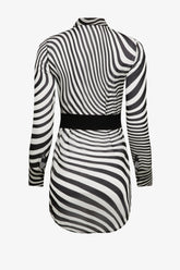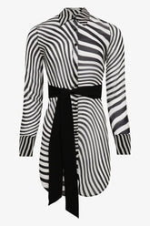 Das Fever-Hemdkleid ist aus fließendem, halbtransparentem Viskose-Crêpe mit psychedelischem Print gefertigt und verleiht der Silhouette eine luftige, raffinierte Ausstrahlung. Sein gerader Schnitt mit abgerundetem Saum, der an den Seiten etwas kürzer ist, enthüllt dezent das Bein und streckt die Figur mit Leichtigkeit. Es wird vorne mit kontrastierenden schwarzen Knöpfen mit Maison-Close-Gravur geschlossen und erinnert an die breiten, geknöpften Manschetten sowie den klassischen Hemdkragen. Ein abnehmbarer schwarzer Gürtel betont die Taille ganz nach Wunsch.