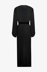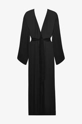 Der Kimono Fever ist aus fließendem, halbtransparentem Viskose-Crêpe in Schwarz gefertigt – perfekt, um jedem Badeanzug eine leichte Note zu verleihen. Sein langer, gerader und luftiger Schnitt wird von einem abnehmbaren schwarzen Gürtel mit abgeschrägten Kanten strukturiert, der durch zwei seitliche Gürtelschlaufen geführt wird. Die langen, weiten Ärmel unterstreichen die großzügige, schwebende Silhouette dieses Modells – ideal über Bademode oder als elegantes Outfit zu tragen.