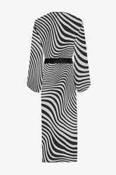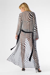 Der Kimono Fever ist aus fließendem, halbtransparentem Viskose-Crêpe mit psychedelischem Print gefertigt – perfekt, um jedem Badeanzug eine leichte, stilvolle Note zu verleihen. Sein langer, gerader und luftiger Schnitt wird von einem abnehmbaren schwarzen Gürtel mit abgeschrägten Kanten strukturiert, der durch zwei seitliche Gürtelschlaufen geführt wird. Die langen, weiten Ärmel unterstreichen die großzügige, schwebende Silhouette dieses Modells – ideal über Bademode oder als elegantes Outfit zu tragen.