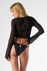 Das schwarze Fever-Langarmtop ist aus leichter, halbtransparenter Viskose-Crêpe gefertigt – perfekt für sommerliche Silhouetten oder elegante Layering-Looks. Dieses vielseitige Modell lässt sich in der Taille binden, vorne oder hinten, um je nach Stimmung unterschiedliche Effekte zu erzeugen. Der tiefe Ausschnitt, der vorne oder hinten getragen werden kann, unterstreicht den sinnlichen und wandelbaren Charakter des Tops. Die leicht ausgestellten langen Ärmel verleihen dem Modell eine anmutige Bewegung – ideal sowohl am Meer als auch in der Stadt.