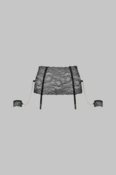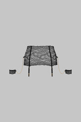 Strapsgürtel aus elastischer Spitze mit Blumenmuster. Schmuckhandfesseln mit dünnen, abnehmbaren goldenen Ketten, die Sie nach Lust und Laune anbringen oder abnehmen können. Vier Strapshalter in Schwarz und Gold geben dem Kleidungsstück Struktur.