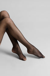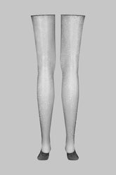 Die kultigen gerollten Strümpfe von Maison Close. Silberfarbenes Lurex®-Garn ziert dieses feine Netzgewirk. Mesh in Ultra-Glitzeroptik bei weichem Tragegefühl. In Kombination mit Kleidern von Maison Close mit atemberaubenden Öffnungen bringt dieses Modell Ihre Beine in raffinierter Glitzeroptik zur Geltung. Da sie an den Füßen nicht verstärkt sind, können Sie dazu ruhig Sandalen mit Absätzen tragen. Gefertigt in Italien in einer exklusiven Werkstatt.