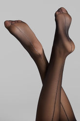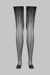 Die kultigen halterlosen Strümpfe von Maison Close. Sie sind schwarz mit zarten silbernen LUREX®-Nähten, die die Rückseite der Beine elegant betonen und einen festlichen, grafischen Stil erzeugen. Der feine, seidige 20-Denier-Voile lässt sich mit einem Strumpfhaltergürtel für eine perfekte Passform kombinieren.