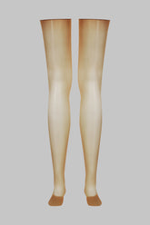 Die charakteristischen Strümpfe mit gerolltem Abschluss von Maison Close. Der Karamellfarbton hebt die Beine elegant hervor und verleiht einen einzigartigen Stil. Der seidige Voile mit 20 Denier zeichnet sich durch seinen außergewöhnlichen Glanz aus und wird mit einem Strumpfhalter für perfekten Sitz kombiniert.