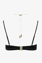 Bralette-Bikini-Oberteil ohne Bügel, das satinierte Weichheit mit stilvoller Raffinesse vereint. Die nahtlos vorgeformten Cups sind durch eine elegante Plissierung am Dekolleté raffiniert strukturiert. Das Nackenband ist verstellbar und umpositionierbar dank eines einzigartigen Schiebers und der goldfarbenen „Lipstick“-Accessoires, signiert von Maison Close – es betont das Dekolleté und erlaubt eine individuelle Anpassung nach Wunsch. Die feinen, flachen und verstellbaren Träger garantieren einen perfekten Sitz. Ein elastisches Unterbrustband umschmeichelt und formt die Brust auf harmonische Weise. Rückenschluss mit edlem Schmuckelement.