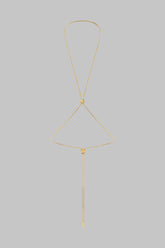 Das Harnais Chaîne À Ton Cou ist ein Körper-Schmuckstück mit fließenden Linien, entworfen, um die Kurven mit selbstbewusster Sinnlichkeit zu umspielen. Mit einer Länge von 200 cm lässt es sich dank seiner zwei Schieber mit Maison Close Gravur unendlich variieren: um die Taille drapiert, als Akzent auf dem Dekolleté oder zur Betonung des unteren Rückens.