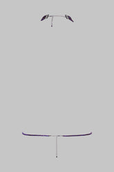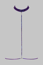 Das Schmuck-Harness „À ton cou“ offenbart sich durch facettierte Glasperlen in einem tiefen Violett, die das Licht im Rhythmus der Bewegungen reflektieren. Halsschmuck und Taille lassen sich durch Verstellketten aus schwarzem Metall individuell justieren und anpassen. Sie sind durch ein abnehmbares Harness miteinander verbunden, das verschiedene Stilvarianten ermöglicht.
