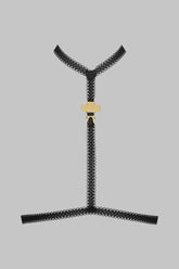 Schmuck-Harness mit Goldkreuz Inspiration Divine. Durch das Spiel mit den elastischen Ziernähten wird die Silhouette perfekt strukturiert, abnehmbar mit goldener Klammer. Am Dekolleté oder im Rücken zu tragen, auf Ihrer Kleidung oder Ihren Dessous, ganz nach Lust und Laune.