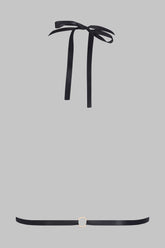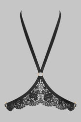 Harness aus feiner Guipure-Spitze, der den Hals bis unter die Brust umschließt. Ein das Dekolleté einkleidendes und betonendes Schmuckstück für die Haut. Auf der Haut oder in Kombination mit Ihrer Garderobe zu tragen. Zarte Satinbänder, die dank feiner goldener Accessoires am Rücken verstellt und am Hals nach Belieben zu- oder losgebunden werden können.