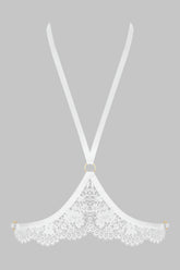 Harness aus feiner Guipure-Spitze, der den Hals bis unter die Brust umschließt. Ein das Dekolleté einkleidendes und betonendes Schmuckstück für die Haut. Auf der Haut oder in Kombination mit Ihrer Garderobe zu tragen. Zarte Satinbänder, die dank feiner goldener Accessoires am Rücken verstellt und am Hals nach Belieben zu- oder losgebunden werden können.