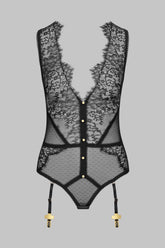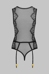 ÄrmelloserString-Body mit V-Ausschnitt aus gotischer Spitze und elastischem Plumetis-Tüll. Durch das Spiel mit den elastischen Ziernähten wird die Silhouette perfekt strukturiert. Kann im Schritt mit Häkchen geöffnet werden. Hervorgehoben durch 4 Strumpfhalter mit goldenen Kreuzabschlüssen, die verstellbar und abnehmbar sind.