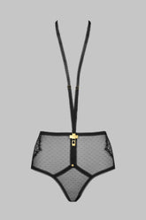 Hohe Unterhose aus gothischer Spitze und elastischem Plumetis-Tüll. Ein Schlitz am Rücken enthüllt den Po-Ansatz. Elastische Ziernähte und Spitze mit Schuppenmuster betonen den Po. Verziert durch ein einstellbares, abnehmbares Harness, das mit einem goldfarbenen Kreuz an verschiedenen Knöpfen befestigt werden kann.