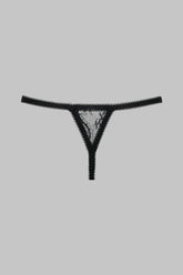 String mit Ausschnitt aus gotischer Spitze und elastischem Plumetis-Tüll. Ein winziges Spitzendreieck am Rücken betont den Übergang zum Po. Elastische Ziernähte und gekreuzter zu öffnender Ausschnitt vorne aus Plumetis-Tüll.