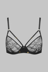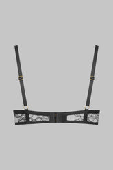 Der Balconette-BH JEUX MAGNÉTIQUES zieht eine direkte Linie zwischen Spitze und Verlangen. Seine bügelförmige Konstruktion hebt die Brust natürlich an, während der überkreuzte Ausschnitt, geschlossen durch subtile goldene Magnetknöpfe, eine kontrollierte Enthüllung inszeniert. Florale Spitze umschmeichelt die Kurven mit Finesse. Verstellbare Elastikbänder am Dekolleté, verstellbare Träger und ein Rückenverschluss sorgen für eine präzise Passform. Jeder Knopf wird zur Geste, jede Öffnung zum Nervenkitzel. Ein Stück für Spielerinnen, die wissen, wann alles kippen muss.