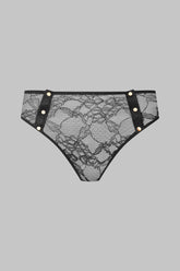 Der High-Waist-String JEUX MAGNÉTIQUES verbindet Retro-Inspiration mit kühner Funktionalität. In elastischer floraler Spitze betont er die Taille und formt die Silhouette, während er zugleich Raum für Spiel lässt. Vorne ermöglicht eine Reihe goldener Magnetknöpfe ein vollständiges Öffnen, das sich bis zum Rücken fortsetzt und dort ein zartes Tropfendetail offenbart. Ein Design, geschaffen, um sich mit einer einzigen Geste zu öffnen und dem Moment anzupassen. Solo tragbar oder in Kombination mit anderen Stücken der Kollektion.