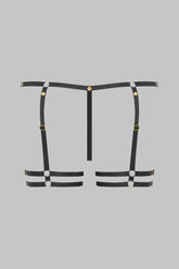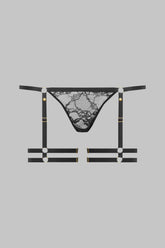 Der Mini-String mit Strapsen JEUX MAGNÉTIQUES verwandelt Dessous in ein Spielfeld. Gefertigt aus elastischer floraler Spitze, kommt er mit abnehmbaren, vollständig verstellbaren Strapsen, die mit goldenen Magnetknöpfen befestigt sind. Die Passform wird durch zwei seitliche goldene Verschlüsse angepasst, während ein Magnetknopf am Rücken das vollständige Öffnen des Strings ermöglicht. Ein verspieltes und vielseitiges Stück, entworfen, um dem Rhythmus des Verlangens zu folgen.