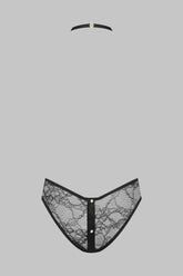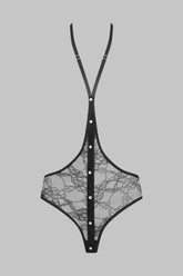 Der Slip mit Harness JEUX MAGNÉTIQUES hüllt den Körper in zarte florale Spitze, veredelt mit einem sinnlichen Harness, das sich um den Hals anpasst. Als zentrales Element des Spiels konzipiert, öffnet er sich vollständig von vorne bis hinten durch eine Reihe goldener Magnetknöpfe, verborgen in seinen Linien. Das Harness wird wie ein Körper-Schmuck getragen, um eine selbstbewusste und strukturierte Silhouette zu zeichnen. Ein einzigartiges Stück, geschaffen, um im gewählten Moment zu enthüllen und zu befreien.